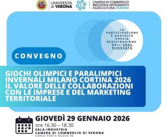 Camera di Commercio di Verona e Università degli Studi di Verona organizzano il Convegno “Giochi Olimpici e Paralimpici Invernali Milano Cortina 2026: Il valore delle collaborazioni con le imprese e del marketing territoriale”, focalizzato sull’importanza e sulle ricadute economiche dei Giochi Olimpici e Paralimpici Invernali sia per le imprese che per il territorio veronese.
